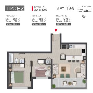6. Planta Tipo B2 – 206 a 406 2 dormitorios · 1 baño Orientación: Sur – Poniente Superficie total: 61,41 m² | Interior: 53,85 m² | Terraza: 7,56 m²