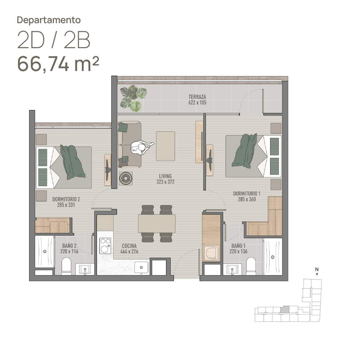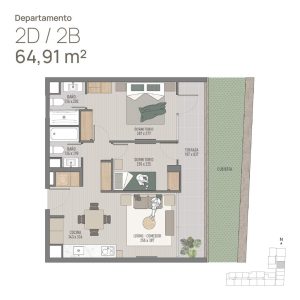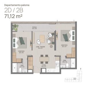 9) Depto 2D · 2B · Paloma 70m2 (Incluye 2 Dormitorios, 2 Baños, Cocina, Living-Comedor y Terraza continua) Sup. total: 70 m² | Útil: 61 m² | Terraza: 9 m²