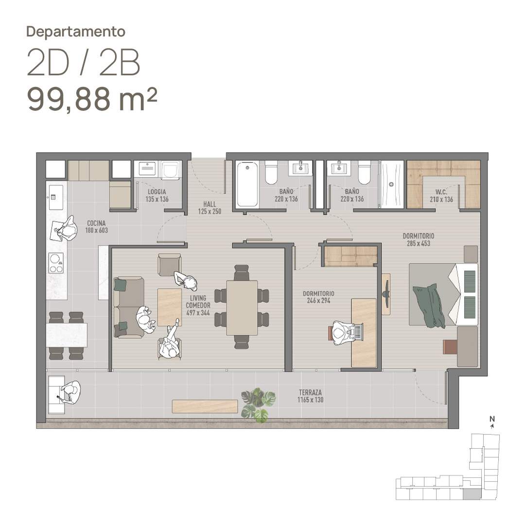 10) Depto 2D · 2B 100m2 (Incluye 2 Dormitorios, 2 Baños, W.C., Cocina Cerrada, Living-Comedor, Hall, Logia, y Terraza continua) Sup. total: 100 m² | Útil: 81 m² | Terraza: 19 m²