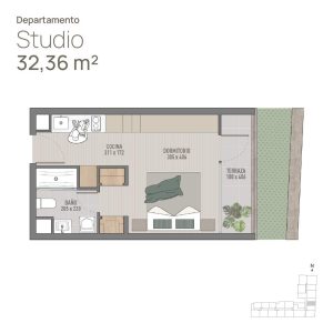 1) Depto Tipo Studio 32m2 (Incluye Dormitorio, Baño, Cocina y Terraza) Sup. total: 32 m² | Útil: 27 m² | Terraza: 5 m²