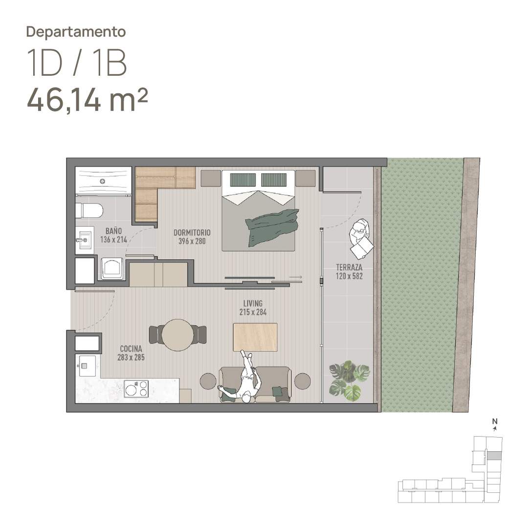 2) Depto 1D · 1B 46m2 (Incluye Dormitorio, Baño, Cocina, Living y Terraza) Sup. total: 46 m² | Útil: 38 m² | Terraza: 9 m²