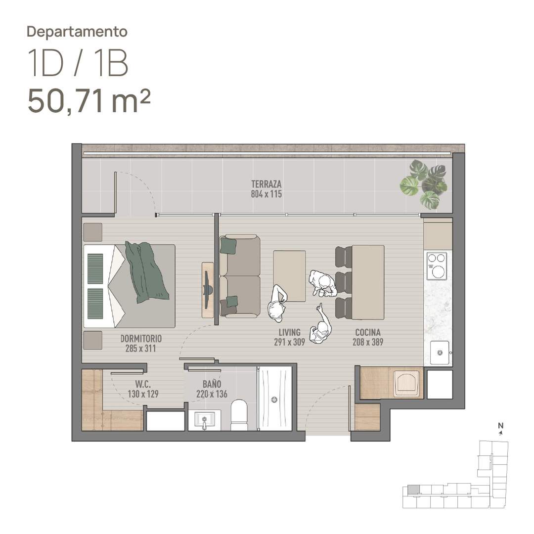 3) Depto 1D · 1B 51m2 (Incluye Dormitorio, Baño, W.C., Cocina, Living y Terraza) Sup. total: 51 m² | Útil: 39 m² | Terraza: 12 m²