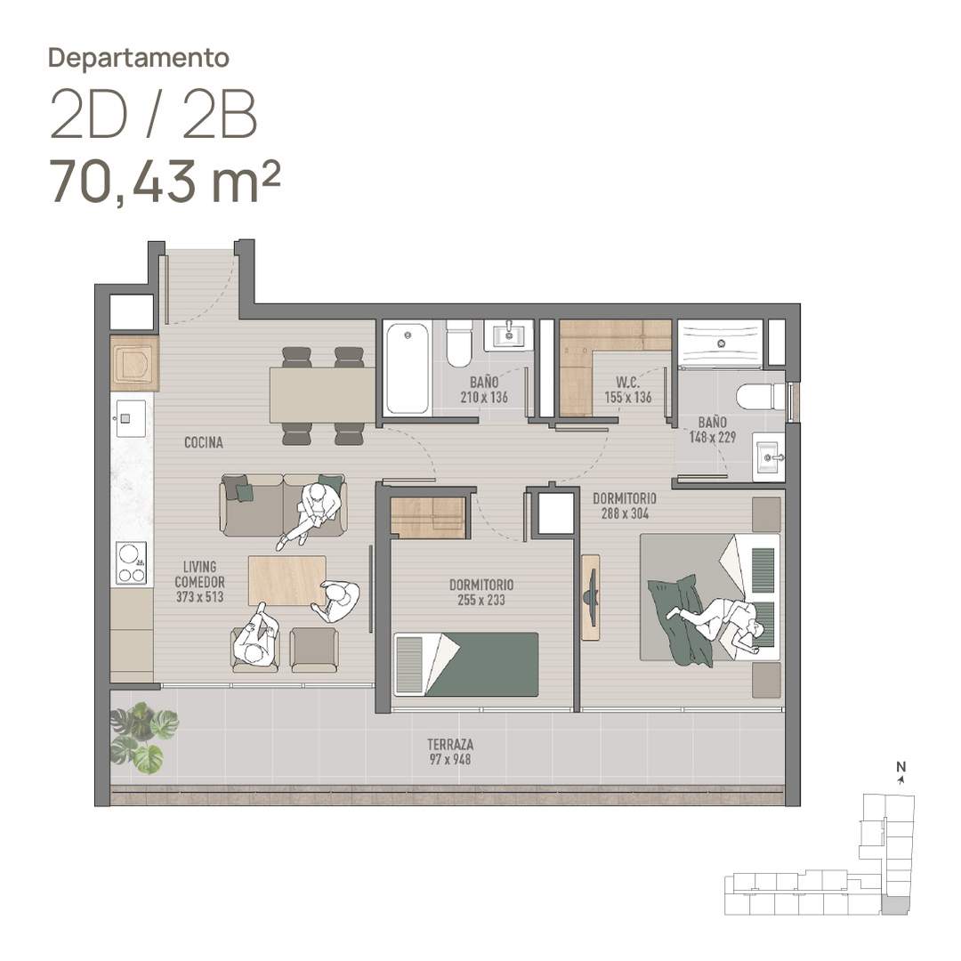 6) Depto 2D · 2B 70m2 (Incluye 2 Dormitorios, 2 Baños, W.C., Cocina, Living-Comedor y Terraza) Sup. total: 70 m² | Útil: 56 m² | Terraza: 14 m²
