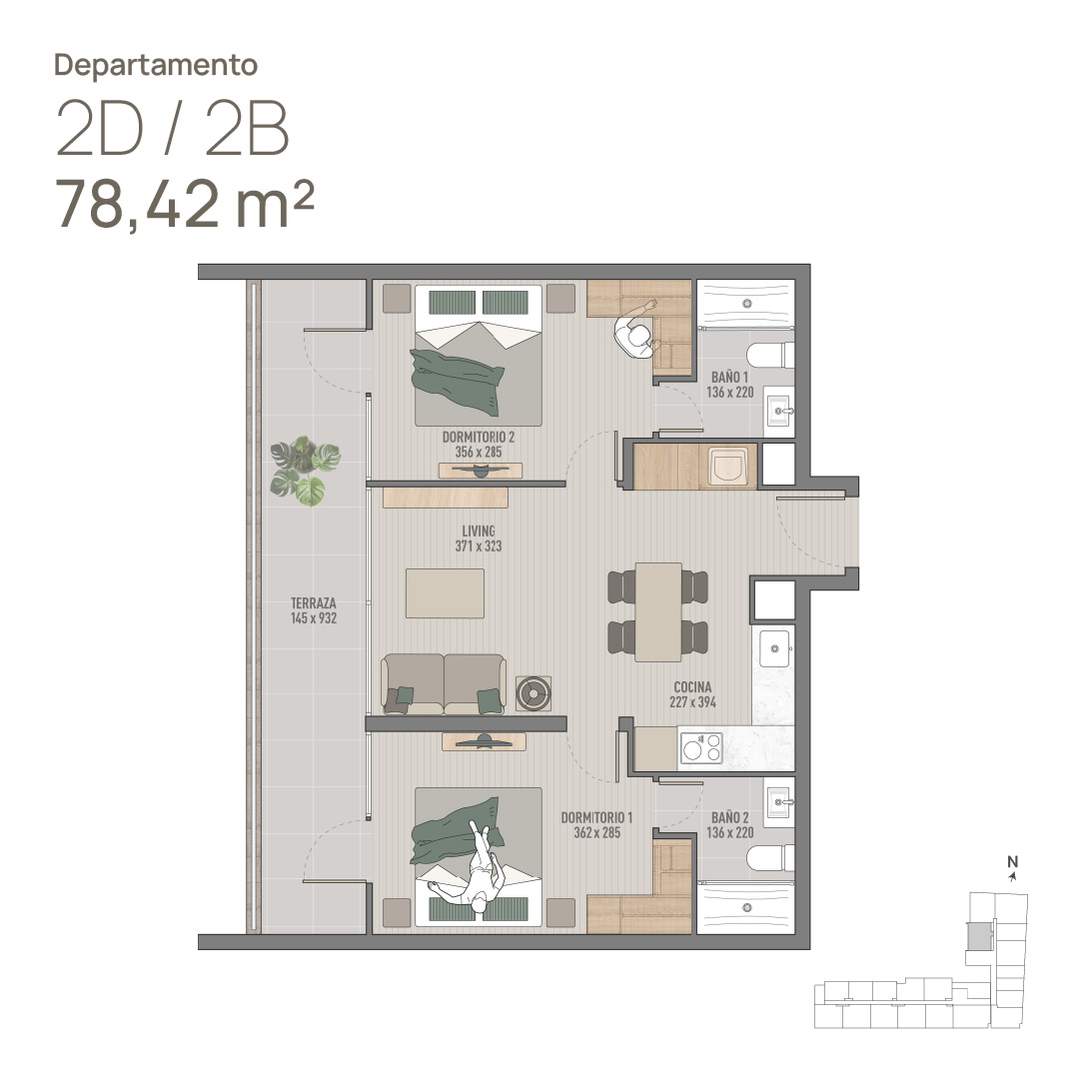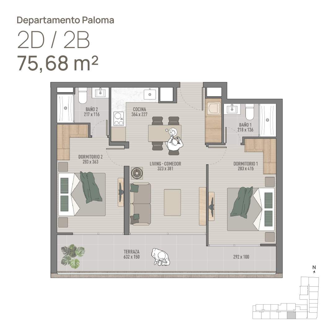 8) Depto 2D · 2B · Paloma 78m2 (Incluye 2 Dormitorios, 2 Baños, W.C., Cocina, Living y Terraza continua) Sup. total: 78 m² | Útil: 61 m² | Terraza: 18 m²